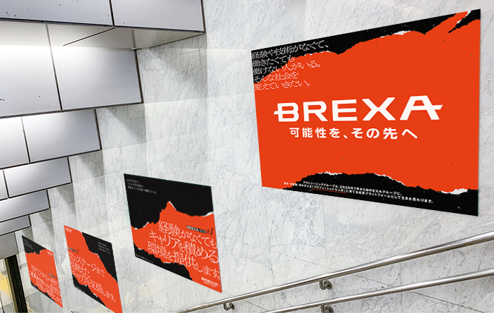 広告ビジュアルは、通勤や通学で駅やバス停を利用する人々の目に留まりやすいよう、コーポレートカラーであるBREXAオレンジとブラックを基調としたシンプルかつ力強いデザインとなっています。各ビジュアルには、日本の「はたらく」の課題と、それに対するBREXAからの「約束」が掲げられています。